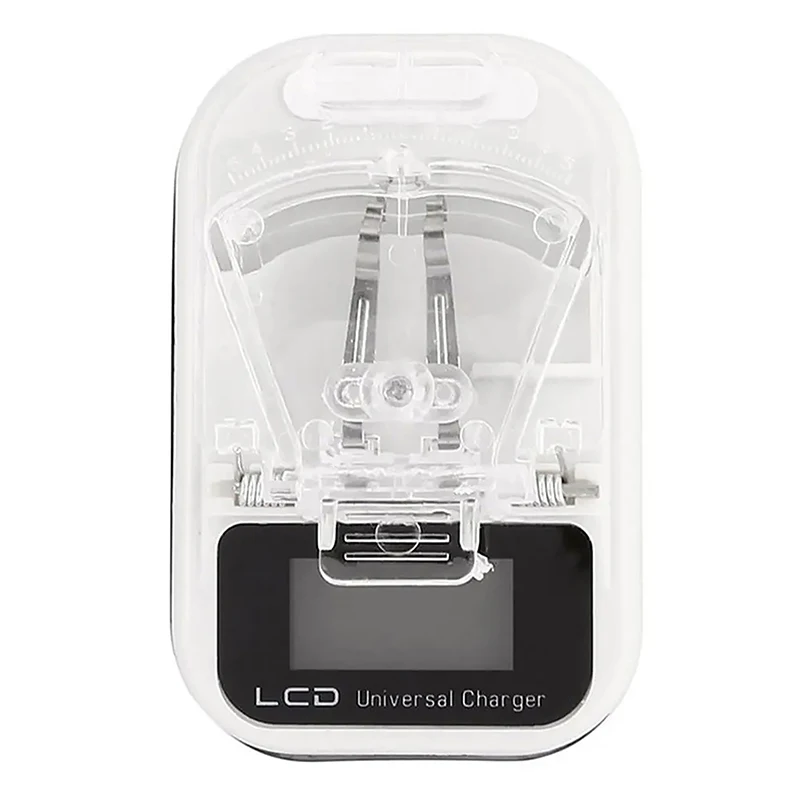 Una solución compacta para cargar baterías Li‑ion extraíbles de móviles y cámaras, con pantalla LCD para ver el progreso y puerto USB lateral para cargar otro dispositivo al mismo tiempo.